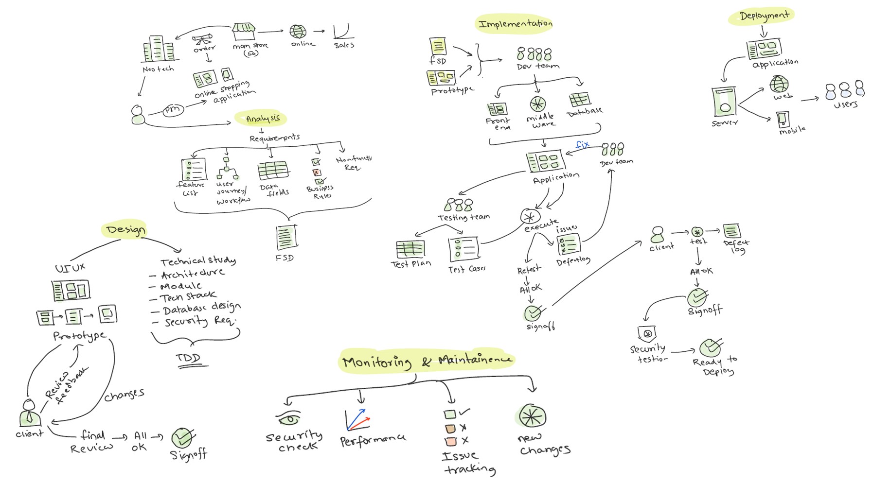 Developers build the application per the FSD and TDD—front-end, middleware, and database—until a working system is ready.